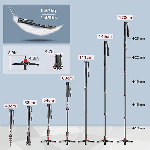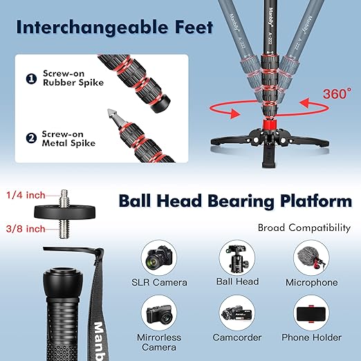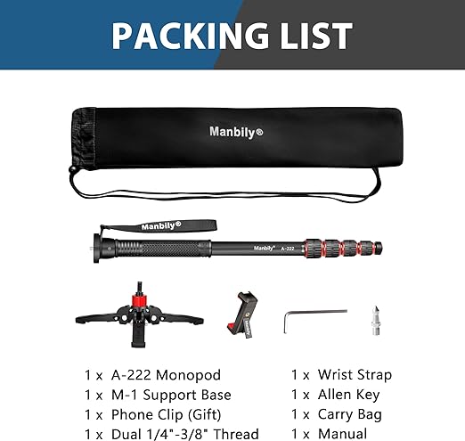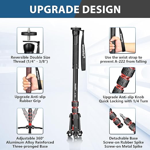 - [Structure Solide] Le monopode Manbilly A-222 est un monopode en alliage d’aluminium léger et compact dont la surface est anodisée, ce qui rend toutes les surfaces métalliques résistantes à l’usure et à la mode. Le procédé CNC offre une résistance et une stabilité accrues des monopodes (jusqu’à 15,5 lbs/7 kg).
